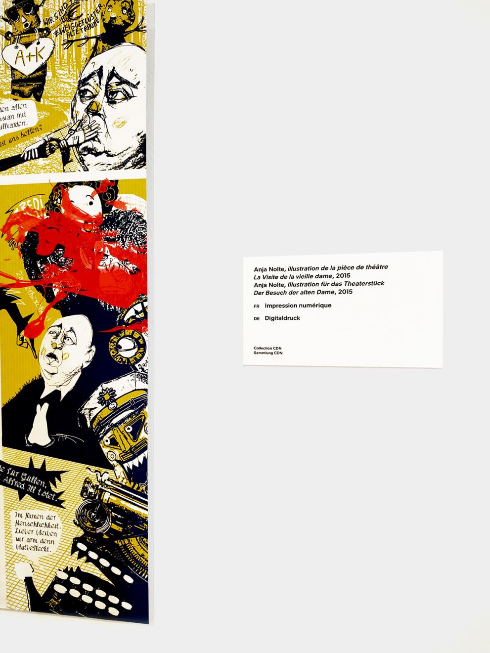 Das Kurpfälzische Museum Heidelberg zeigt im Rahmen der Ausstellung Friedrich Dürrenmatt - Karikaturen Anja Noltes künstlerische Interpretation des berühmten Klassikers Der Besuch der Alten Dame von Friedrich Dürrenmatt. Die Arbeit entstand als Auftragsarbeit für eine Sonderausgabe des Schweizer Kulturmagzin Du.