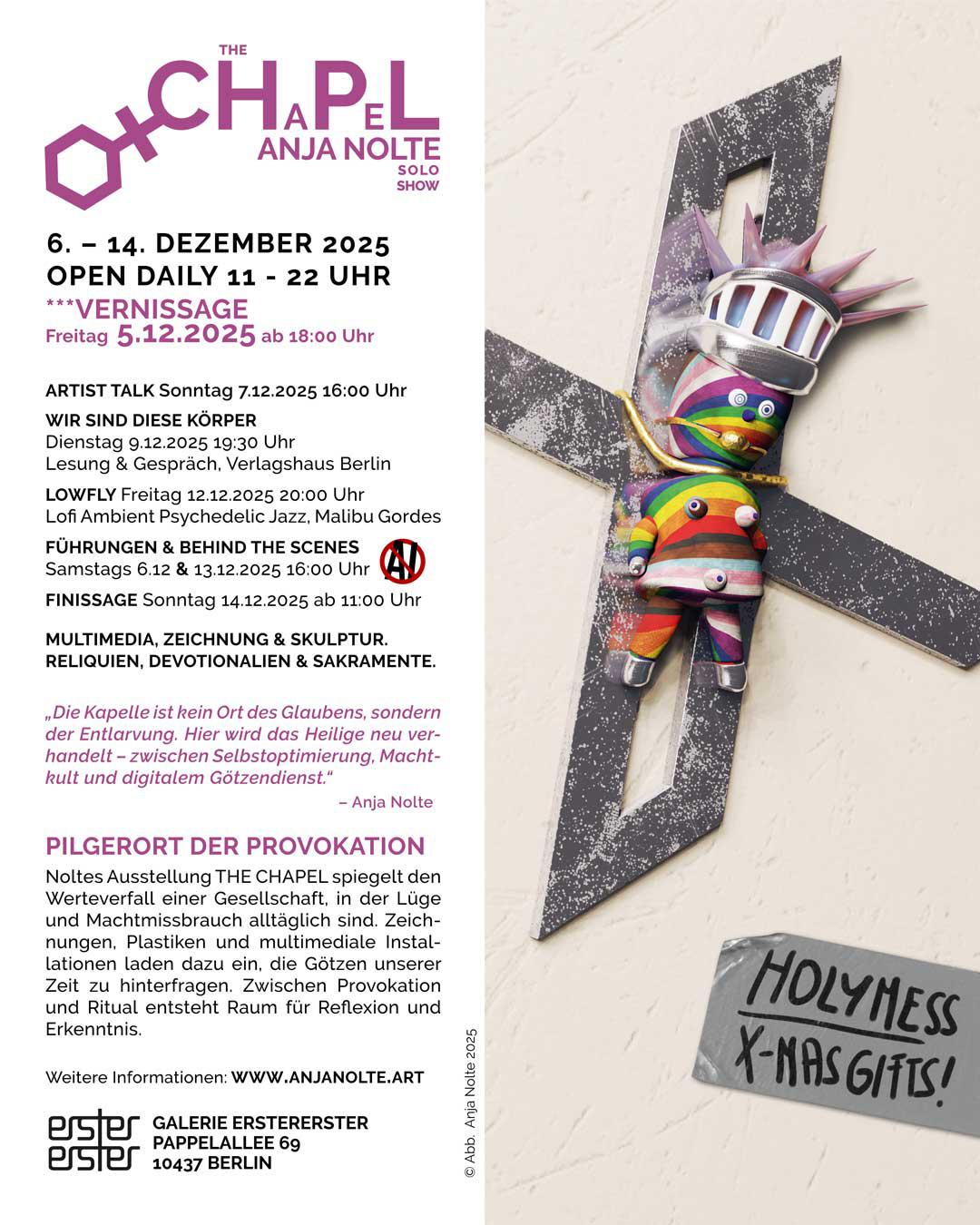 Noltes Ausstellung THE CHAPEL spiegelt den Werteverfall einer Gesellschaft, in der Lüge und Machtmissbrauch alltäglich sind. Zeichnungen, Plastiken und multimediale Installationen laden dazu ein, die Götzen unserer Zeit zu hinterfragen. Zwischen Provokation und Ritual entsteht Raum für Reflexion und Erkenntnis.