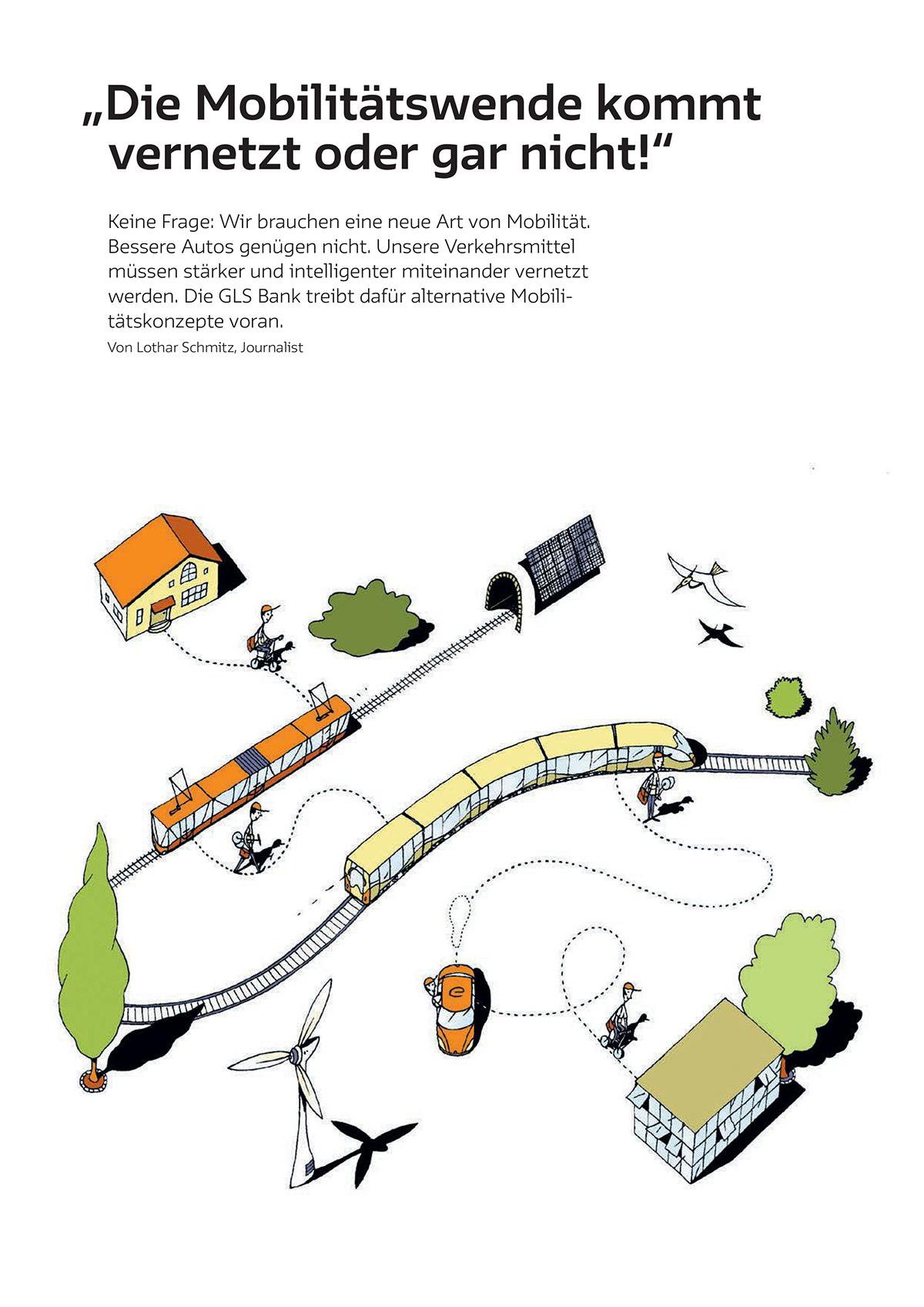 Für das Kundenmagazin Bankenspiegel illustrierte Ingo Fast die Themen Im Dickicht der Weltrettung und‚Die Mobilitätswende kommt vernetzt oder gar nicht.