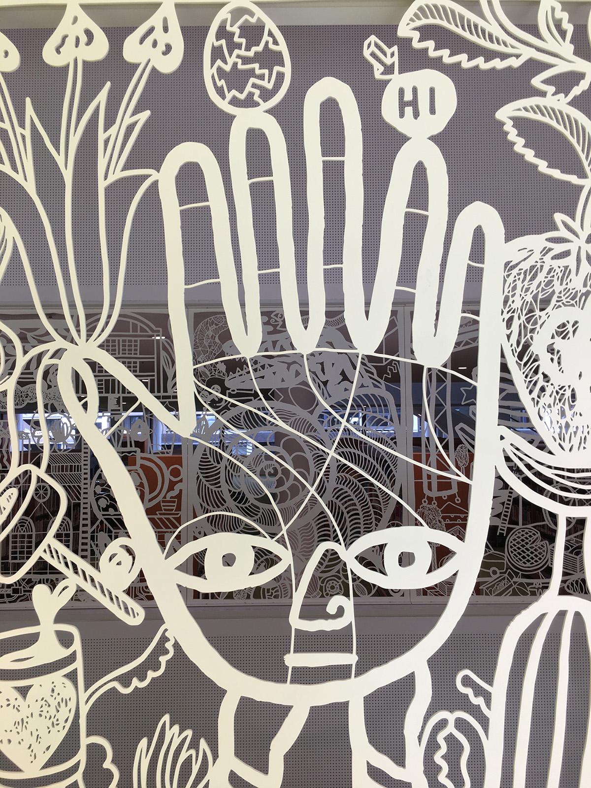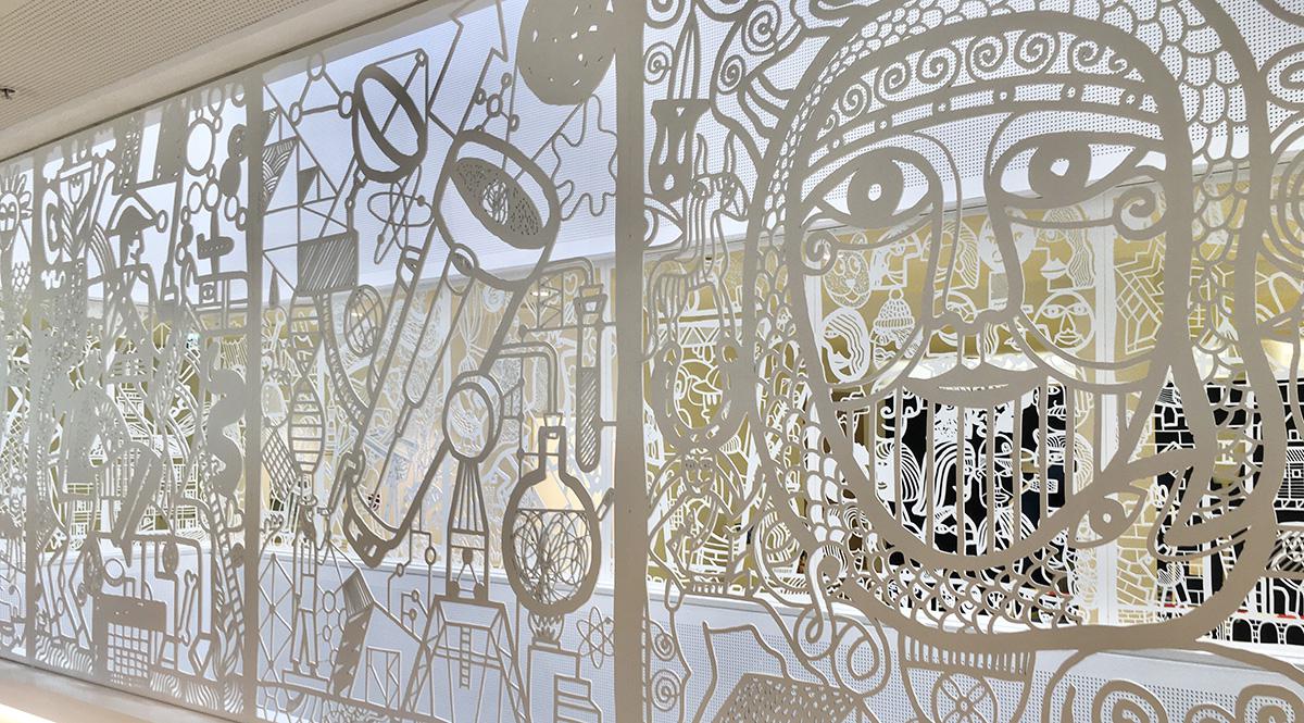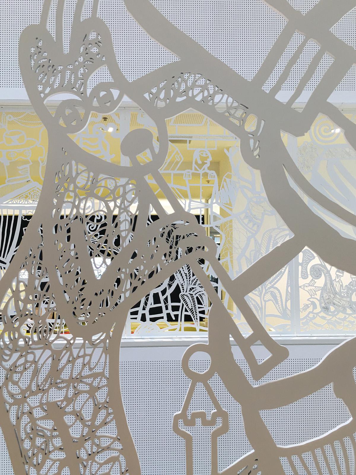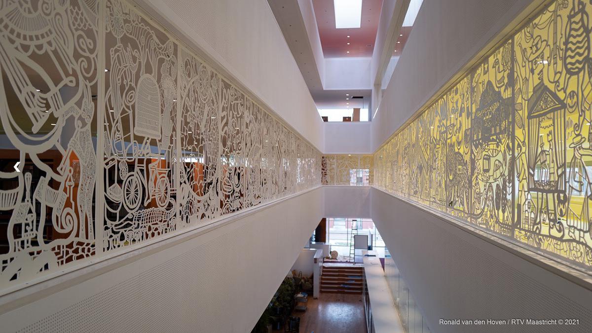 Zuiderlicht, Agentur für Strategie und Design, beauftragt mit der grafischen und illustrativen Gestaltung für den 'Relaunch‘ des Centre Ceramique, suchte für diese Herausforderung die Kooperation mit Stang Gubbels. Stang entwickelte einen riesigen Stapel von Schwarz-Weiß-Illustrationen, die alle möglichen Aspekte der Vergangenheit, Gegenwart und Zukunft der Stadt beinhalten. Sie sind auf der 40 Meter langen Schutzwand, auf Spielelementen, Präsentationsständen (Van Lieshout), Beleuchtungskörpern, Rückwänden usw. zu sehen. Der Stang 'Fallschutz' besteht aus 40 Paneelen. Jede Tafel ist eine Entdeckungsreise für sich.
